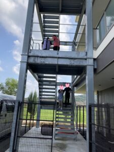 今回は厨房からの出火を想定し、外階段からの避難です😃