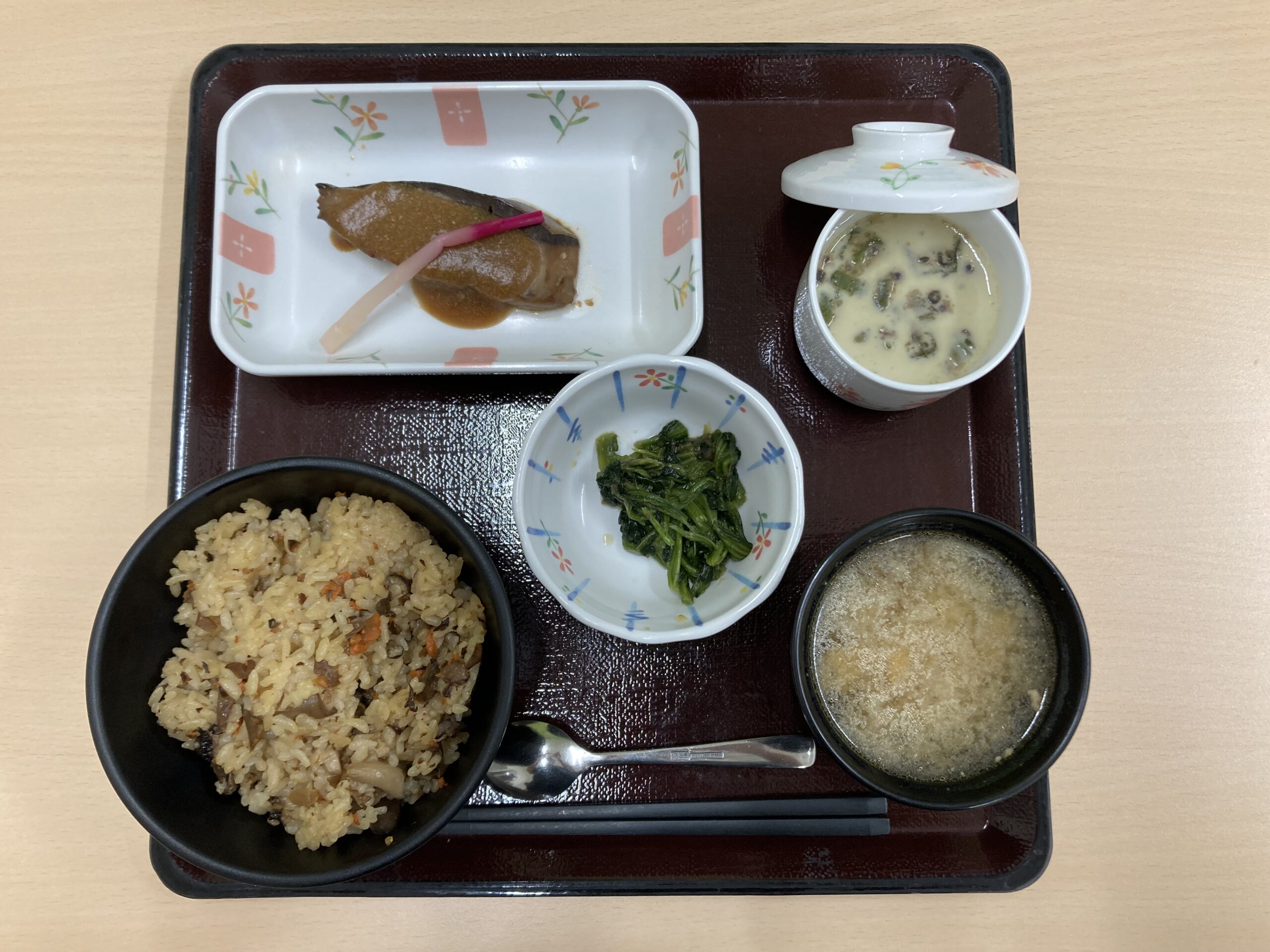 本日の昼食のメニューはキノコの炊き込みご飯、豚汁、ブリの照り焼き、茶碗蒸し、ほうれん草のお浸しです😍